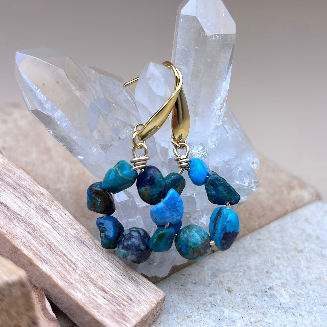 鮮やかなグリーンとブルーの色合いを持つクリソコラを使用した輪っかピアスです☆独特の模様と輝きが耳元を華やかに演出し、シンプルなスタイルでも存在感を際立たせます!さまざまなシーンで活躍するこのピアスは、日常使いから特別な日まで幅広くご利用いただけます☆