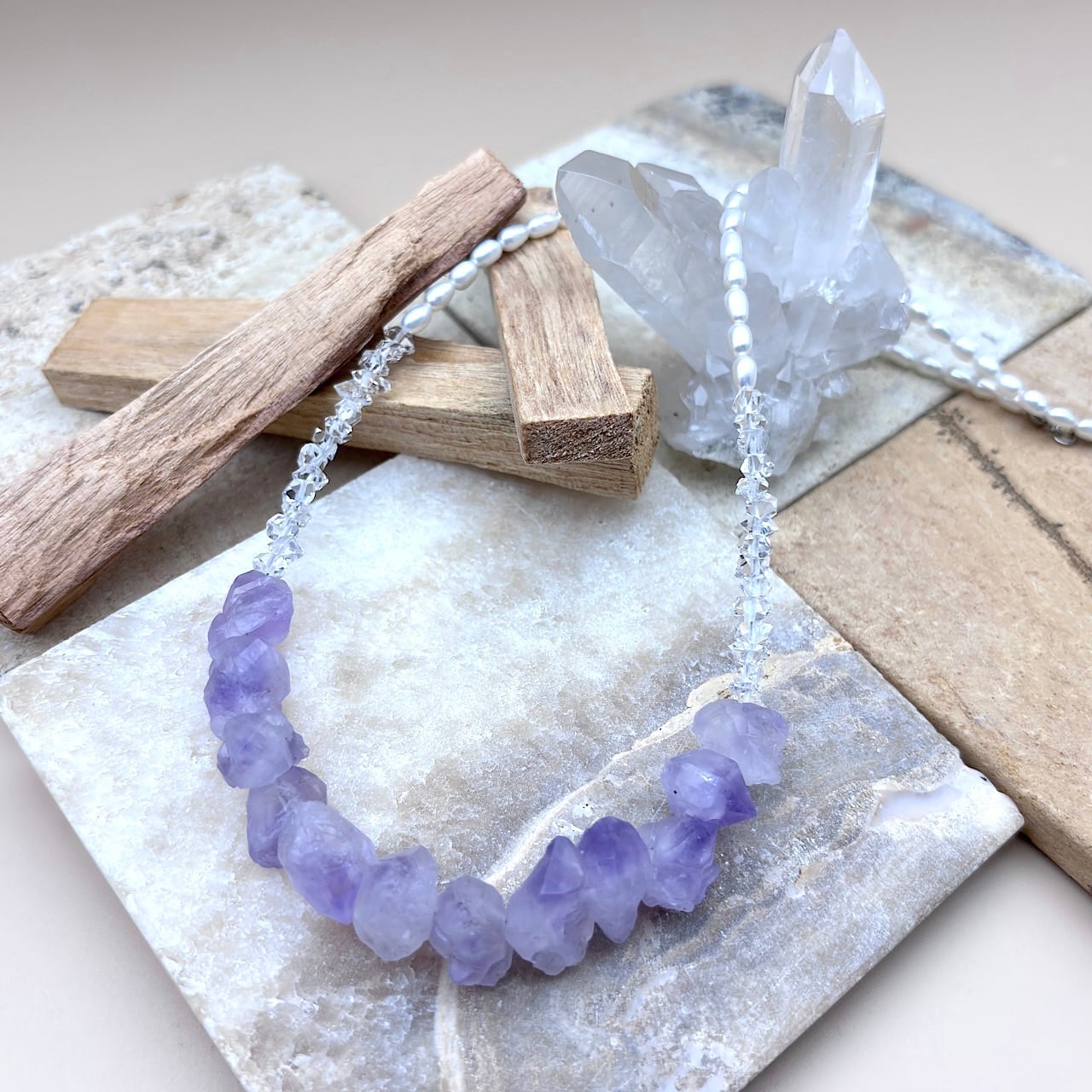 アメジストは、その美しい紫色とクリスタルの透明感で知られ、持つ人に穏やかなエネルギーをもたらします。このネックレスは、内面のバランスを整え、スピリチュアルな成長を促進するアイテムです☆