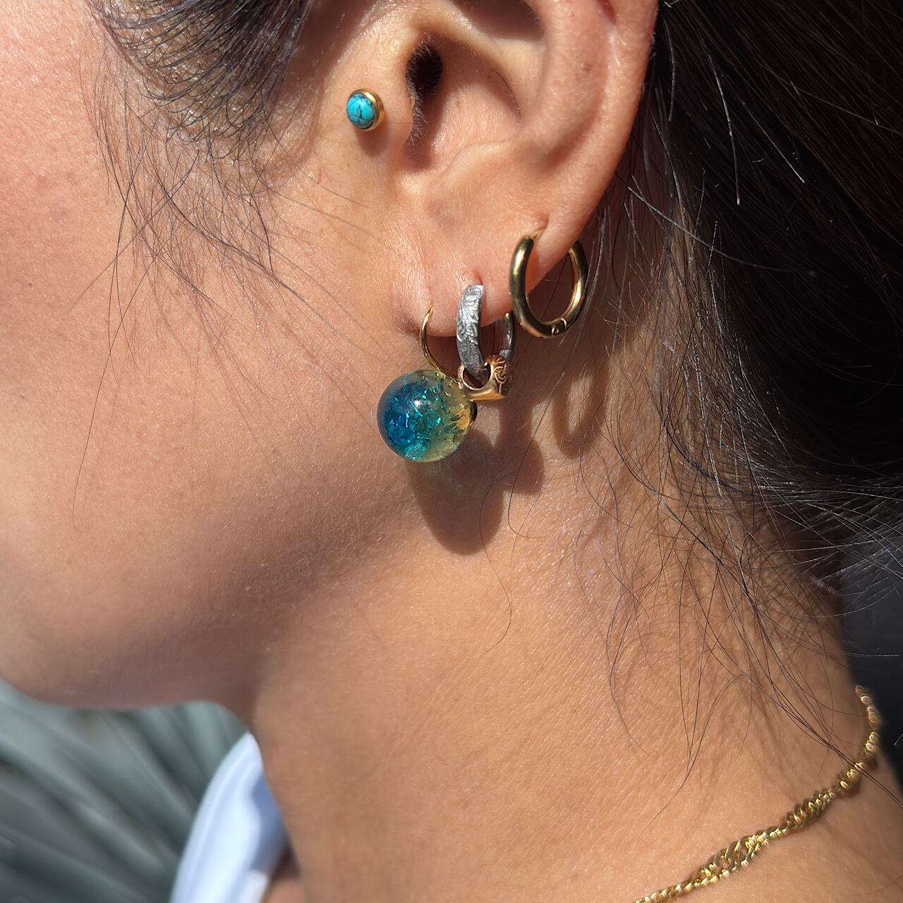 美しいブルーグリーンアンバーを使用した、個性豊かなピアス。このユニークで印象的なピアスは、日常使いから特別なシーンまで幅広く活躍します☆