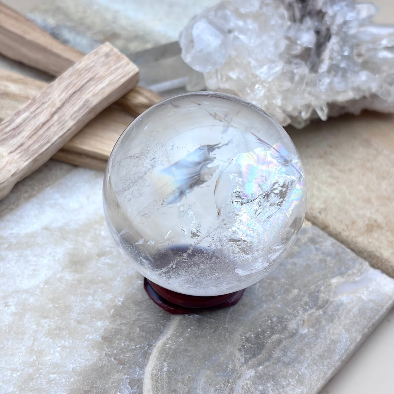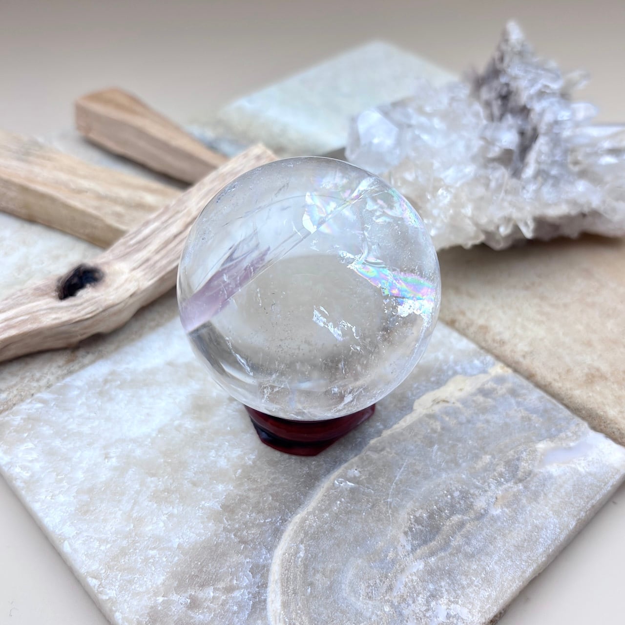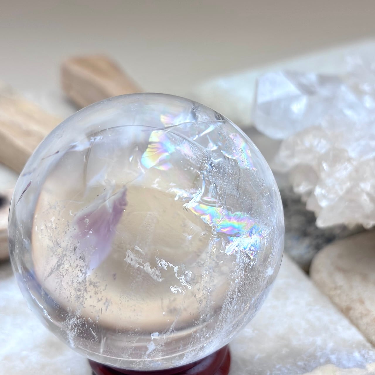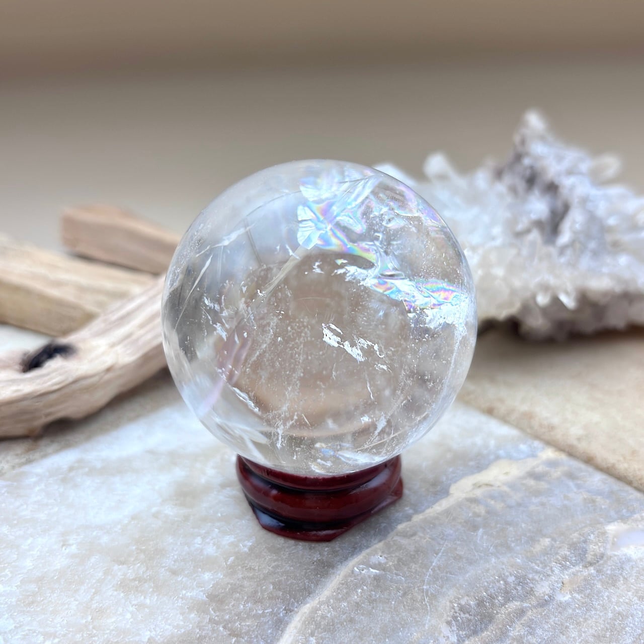 幸運を呼ぶ!☆レインボー水晶丸玉☆台座付き☆