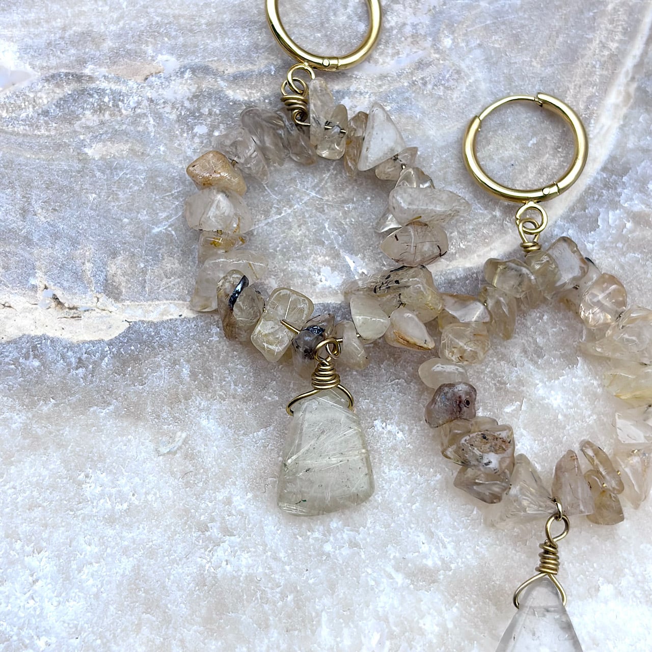 このゴールドルチルピアスは、光を受けて美しく輝くゴールドルチルの特性が特徴的です。繊細な金色の針が、見る者を魅了し、持つ人にエレガントな印象を与えてくれます。