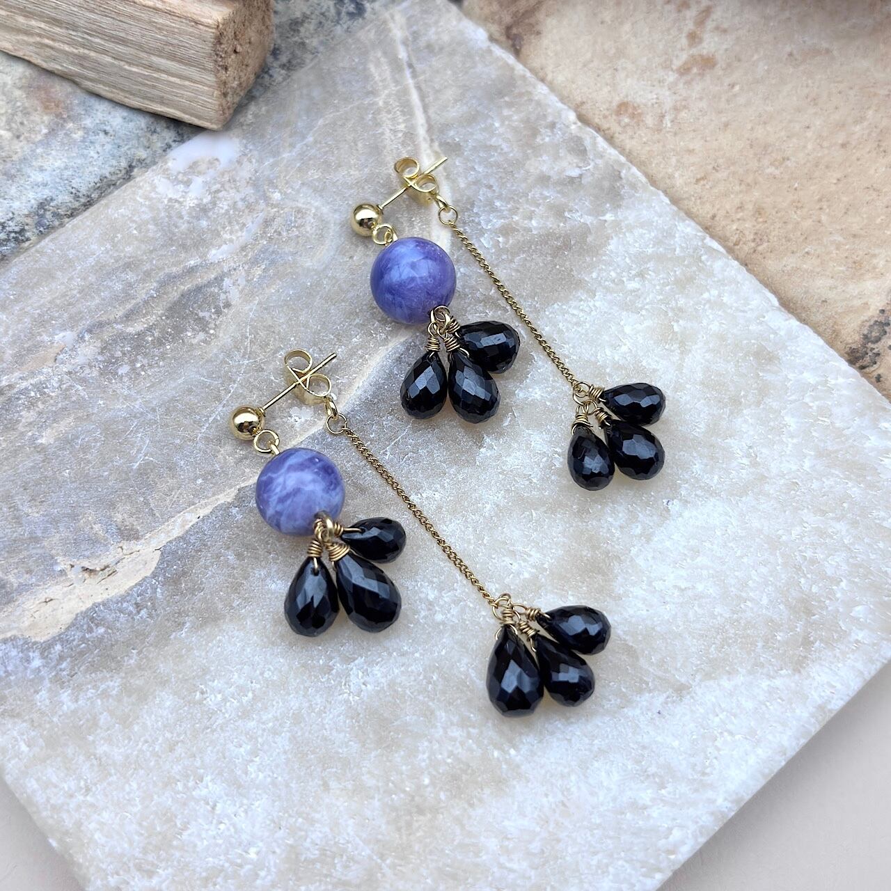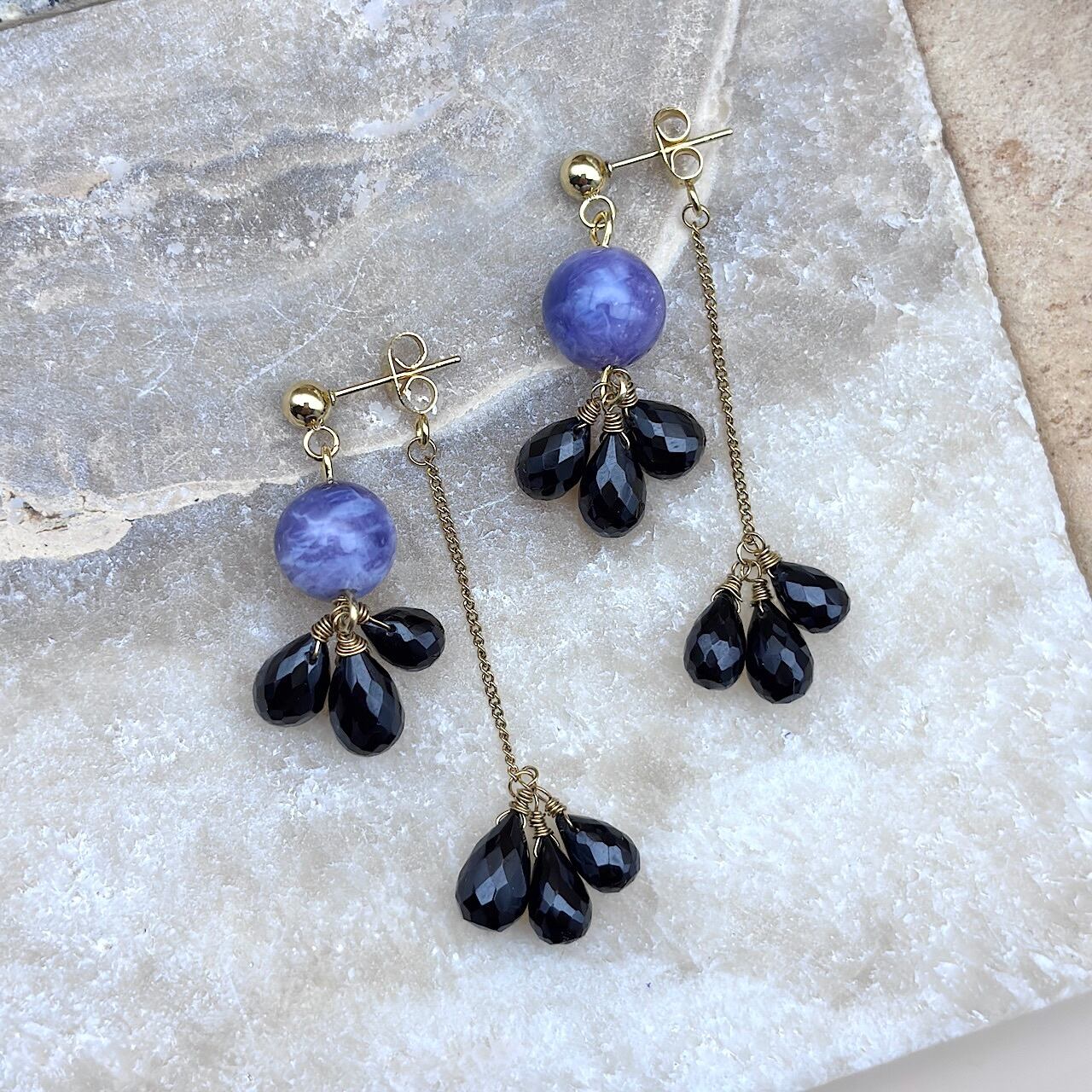 美しいムーンライトアメジストと華やかなブラックスピネルのコンビネーションが魅力のドロップピアスが入荷しました!ムーンライトアメジストの柔らかな光沢と、ブラックスピネルの深い輝きが絶妙に融合し、耳元を特別な存在に引き立てます☆