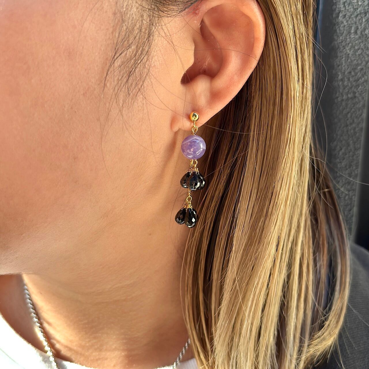 耳元に特別な光を与えるこのムーンライトアメジスト×ブラックスピネルドロップピアスをぜひお楽しみください!あなたのコーディネートに華やかさとスタイルをプラスし、新しい印象を与えてくれること間違いなしです☆