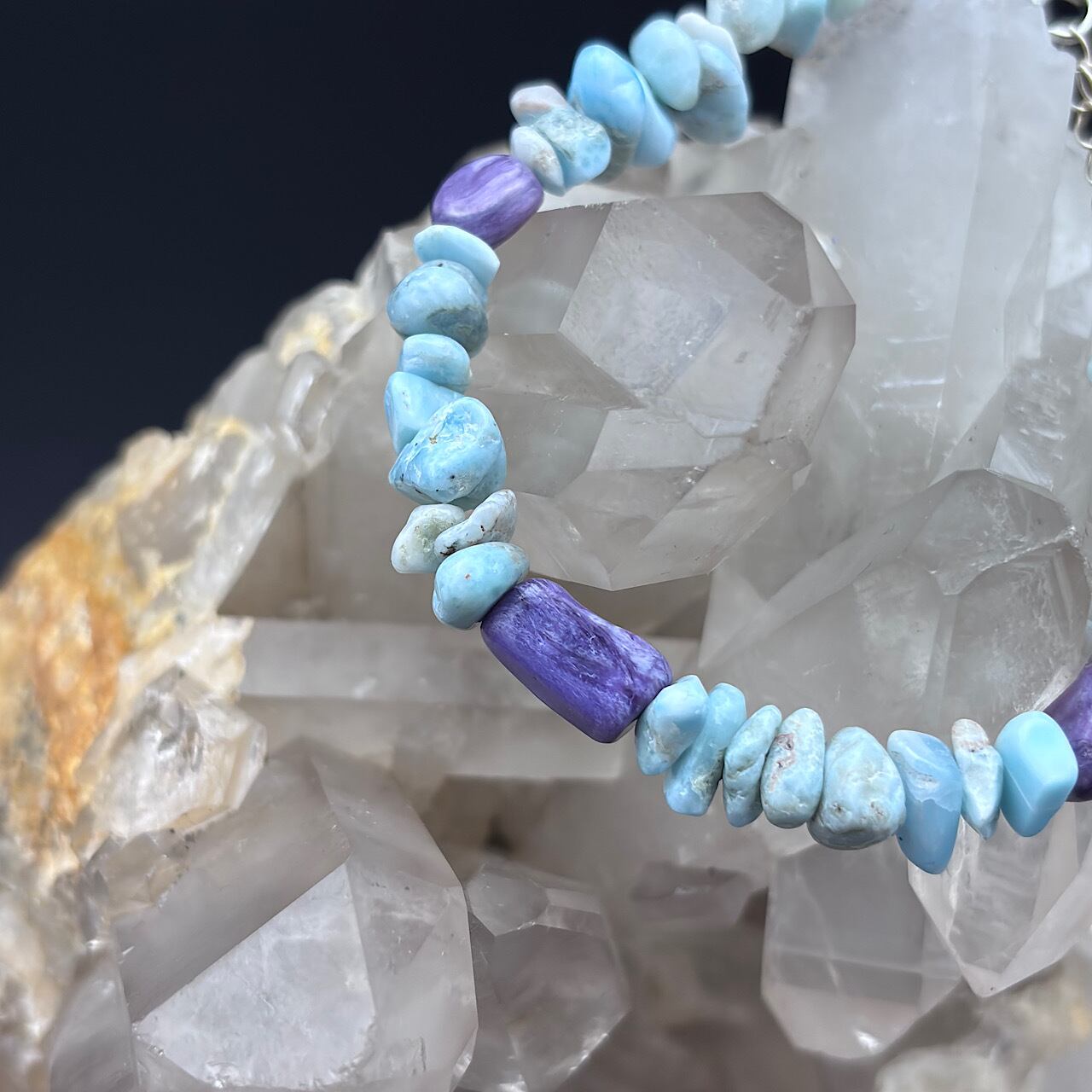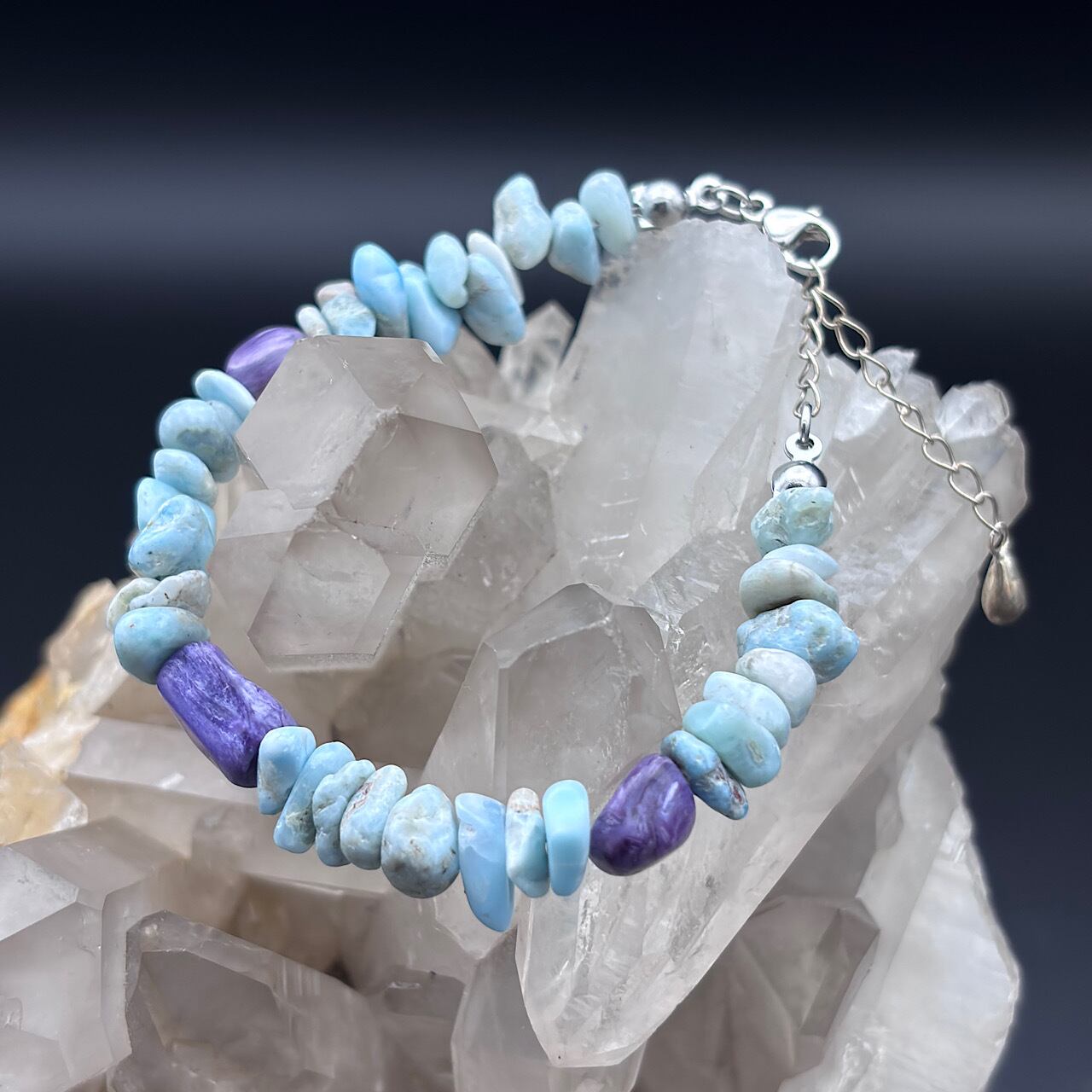 ラリマーとチャロアイトのブレスレットは、日常生活の中で心の安寧を求める方々にとって特別なアクセサリーです。華やかなデザインは、カジュアルなお出かけからフォーマルなシーンまで、幅広くスタイルにマッチします☆
