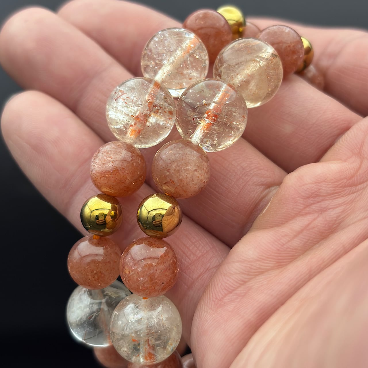 サンストーンファントム・サンストーン・ヘマタイトのブレスレットは、日常生活の中でエネルギーの活性化を求める方々にとって特別なアクセサリーです。華やかなデザインは、カジュアルなお出かけから特別なシーンまで、幅広くスタイルにマッチします☆