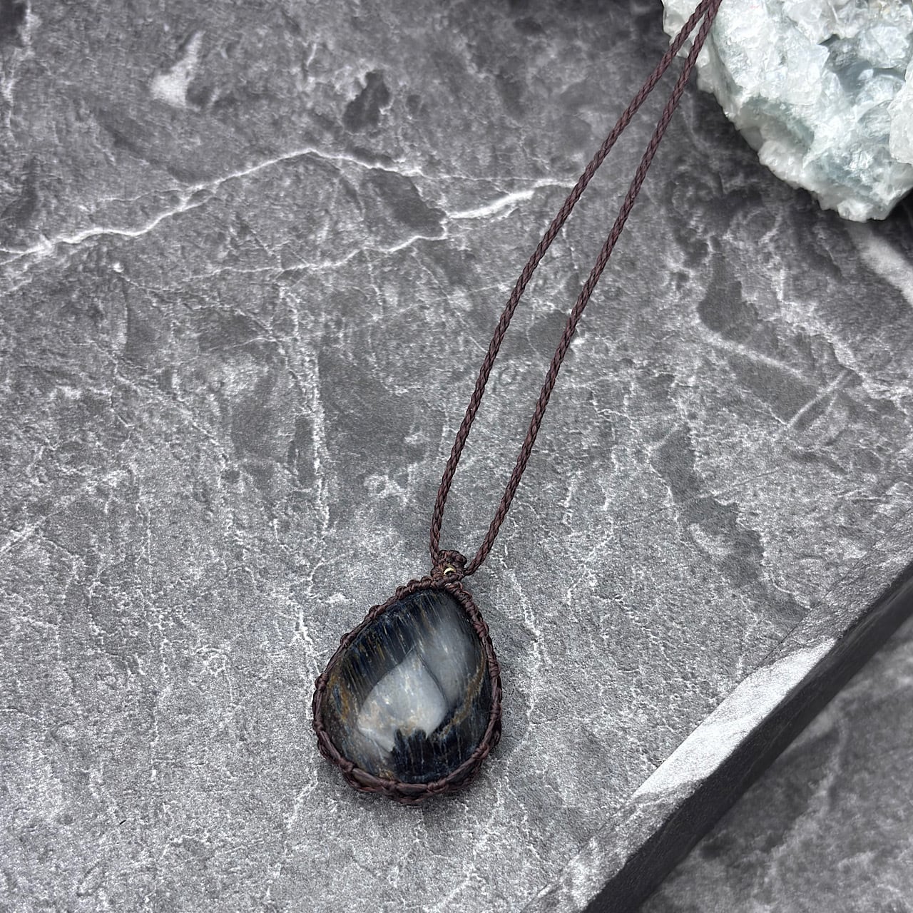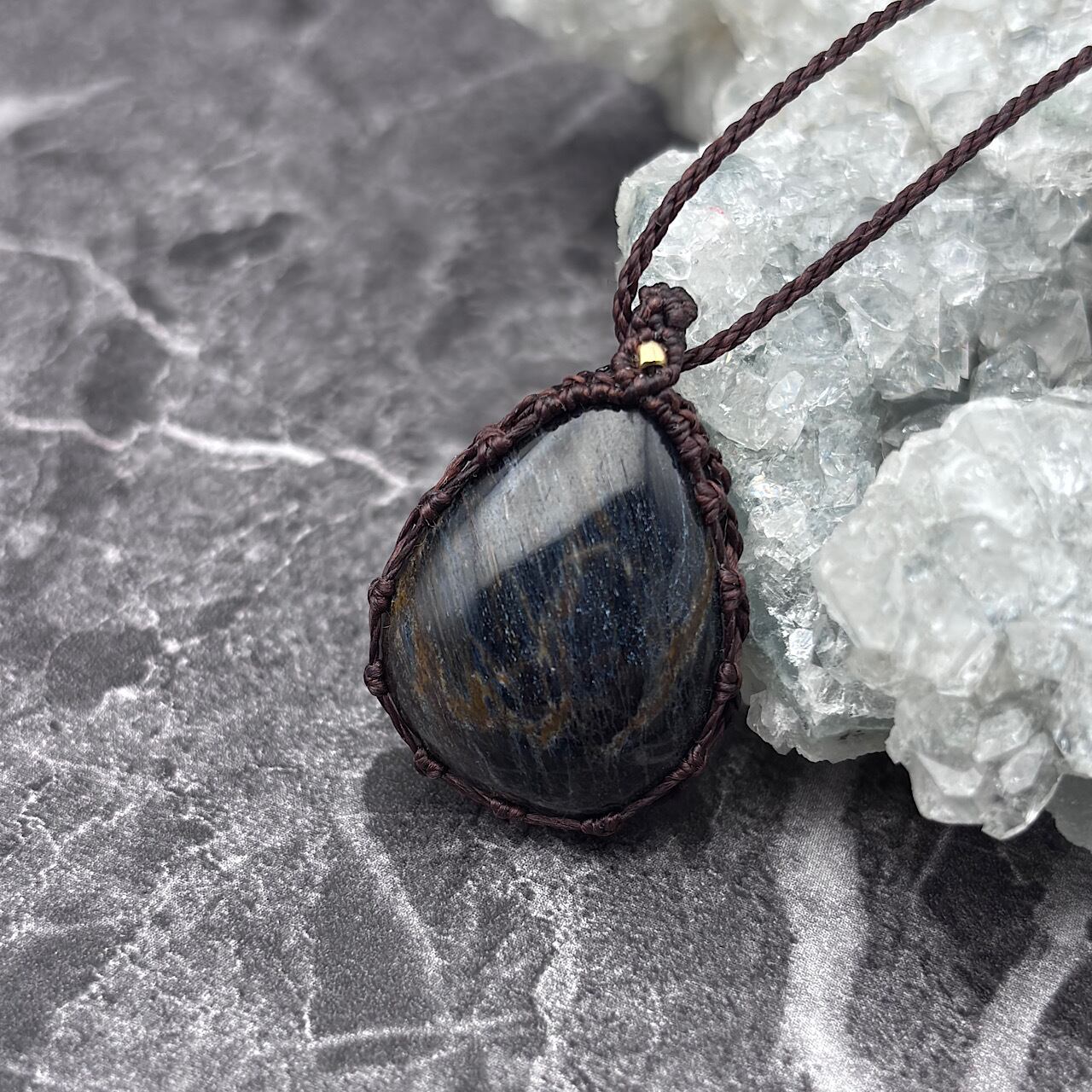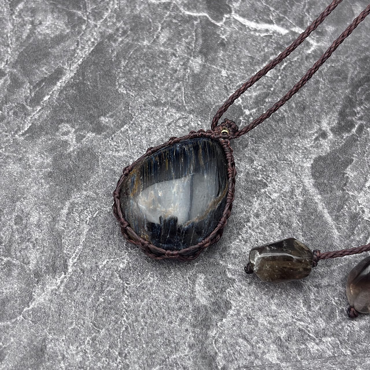 ブルーピーターサイトは、その深い青とグリーンの色合いが特徴で、直感力を高める石として愛されています。スモーキークォーツは、強力な保護石とされ、ネガティブなエネルギーを取り除く効果があります。このネックレスは、デザイン性の高いマクラメ編みと組み合わせることで、シンプルでありながら個性的な存在感を持ち、普段使いから特別なシーンまで幅広く活用できます☆