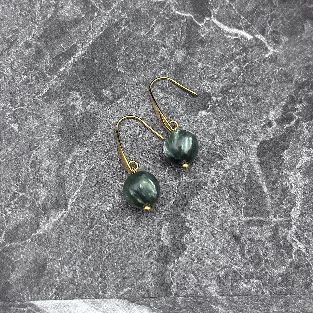 セラフィナイトは、その美しい緑色のマーブル模様が魅力的で、特に癒しの力が強い石として知られています。このピアスは、シンプルながらも個性的な存在感があり、普段使いはもちろん、特別なイベントでも大活躍できます☆