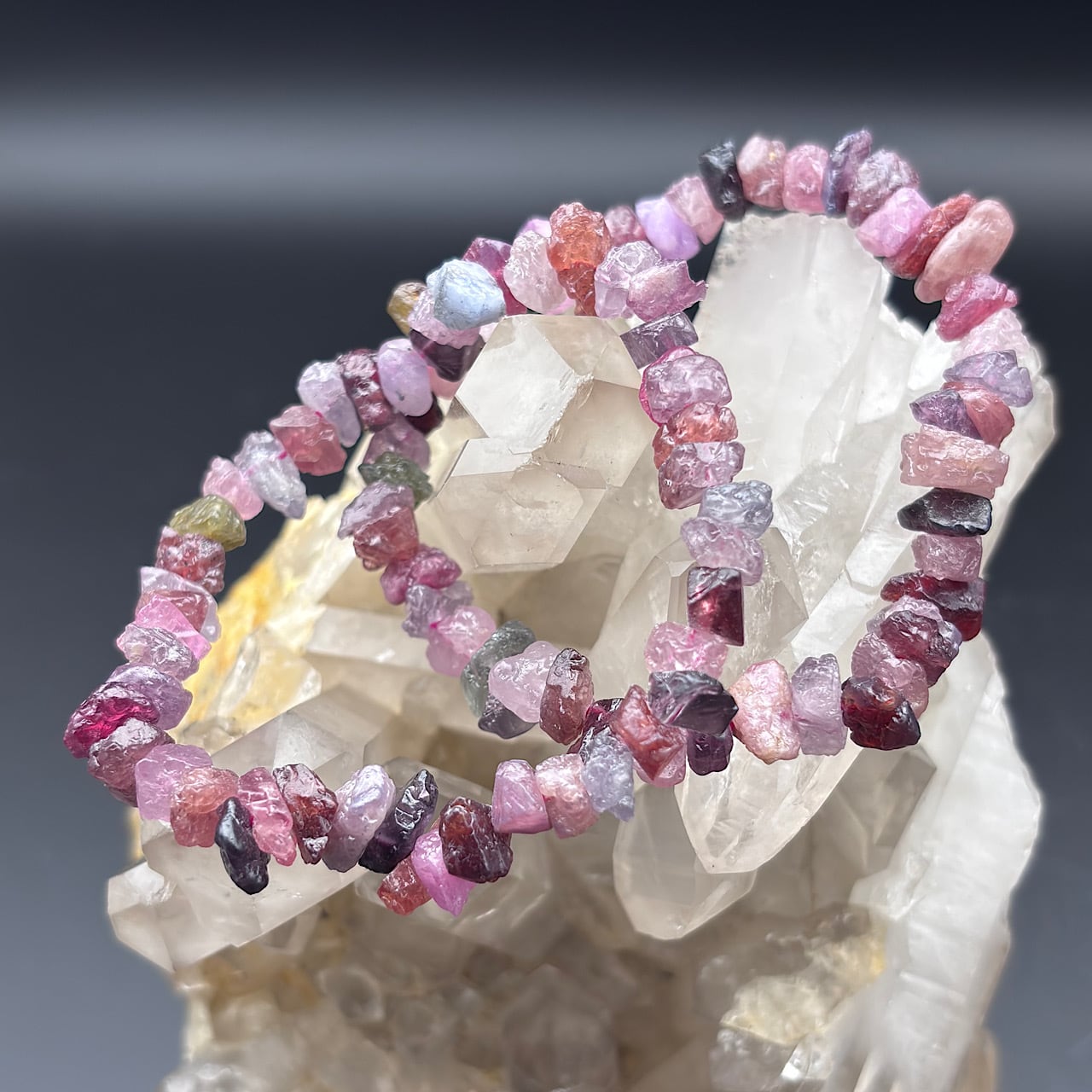 MIXスピネルは、その豊かな色彩が特徴で、様々な種類のスピネルが組み合わさることで、多様なエネルギーを発揮します。このブレスレットは、シンプルながらも個性的な存在感があり、日常使いはもちろん、特別な場面でも美しく演出してくれます☆