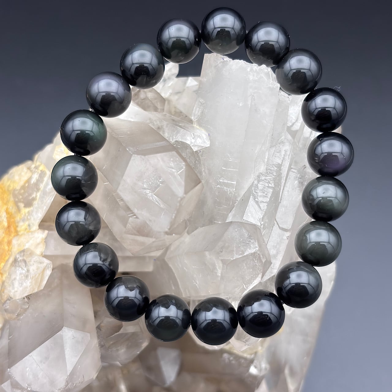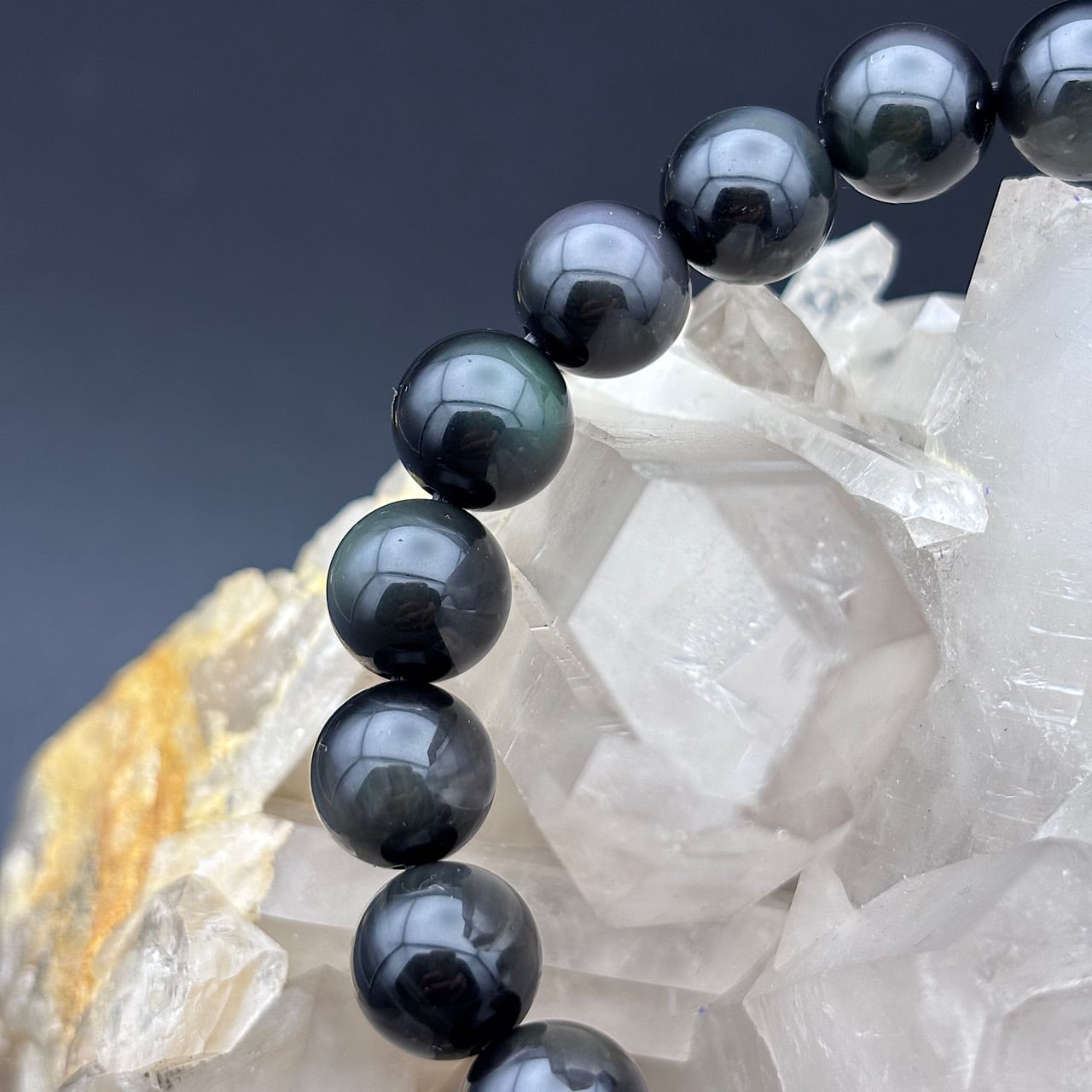 レインボーオブシディアンは、その美しい輝きと多様な虹色の反射が特徴で、持つ人に深い癒しの効果をもたらします。このブレスレットは、シンプルながらも存在感があり、普段使いはもちろん、特別な場面でも美しく演出してくれます☆