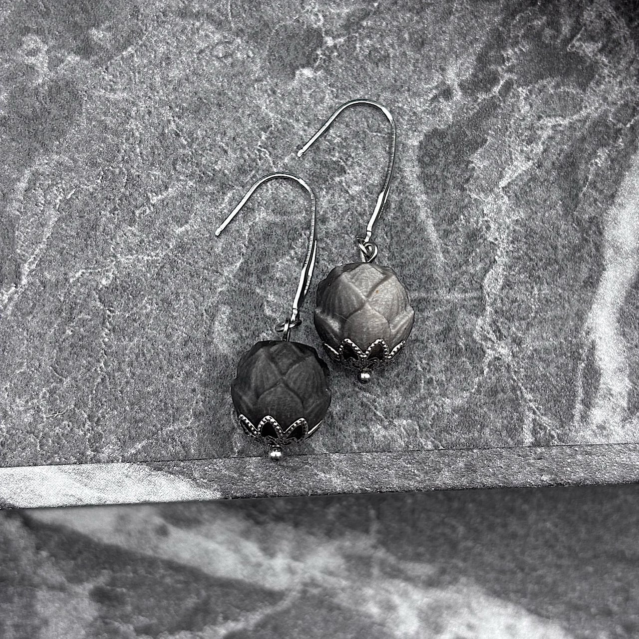 魔除けに☆シルバーオブシディアン蓮彫りピアス☆